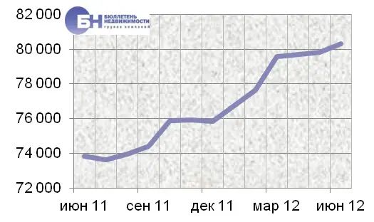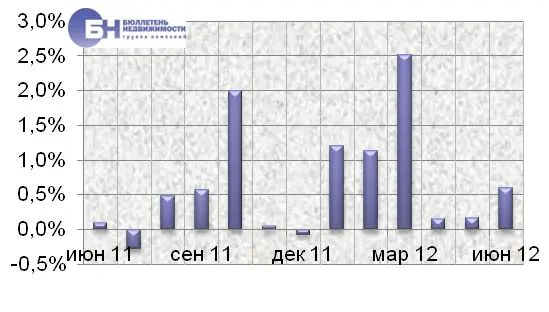 В среднем по рынку строящегося жилья процент изменения цены предложения на однокомнатные квартиры составил 0,6%, на двухкомнатные – 0,3%. Трехкомнатные подорожали на 0,6%. Средние цены предложения в июне 2012 года составляют: однокомнатные квартиры – 3,3 млн руб., двухкомнатные – 4,9 млн руб., трехкомнатные – 7,4 млн руб.