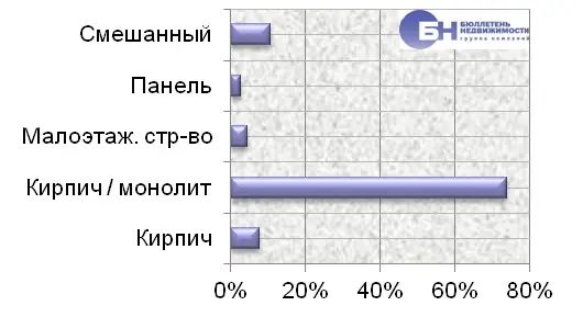 В предложении с разбивкой по типу домов преобладают в большей степени кирпично-монолитные дома, это 74,1% от всего рынка. Меньшая доля предложения в панельных домах – 2,8%. Доля домов смешанного типа, как правило,это дома с корпусами различной постройки (кирпично-монолитный и панельный), составляет 10,7%. Малоэтажное строительство на рынке строящегося жилья занимает 4,6% от общего объема новостроек.