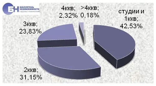 В структуре предложения на рынке новостроек по-прежнему преобладают студии, однокомнатные и двухкомнатные квартиры, что занимает 73,7% рынка, трехкомнатные составляют в среднем 23,8%. Многокомнатные (от 4 и более комнат) составляют 2,5% от общего объема квартир в строящихся домах.