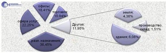 В структуре предложения преобладают помещения различного назначения (как правило – это объекты назначение которых не конкретизировано и они могут быть использованы как под офис, так и под торговлю либо сферу услуг), что составляет 36,5%. Помещения, предназначенные для сферы услуг, занимают долю в размере 22,3%, офисные помещения – 18,4%. Доля продаваемых торговых площадей составляет 10,9%. Минимальный процент от общего объема занимают здания, участки, объекты предназначенные под производство и складские помещения.