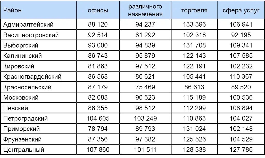 Самые дорогие помещения под сферу услуг находятся в Центральном районе (в среднем 127,8 тыс. руб. за кв. м), самые дешевые в Красносельском (89,5 тыс. руб. за кв. м).