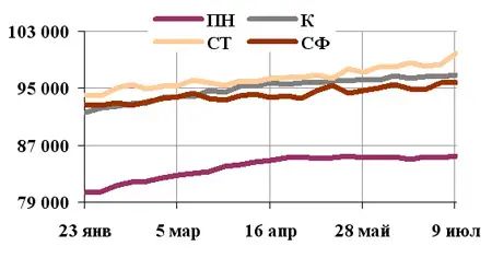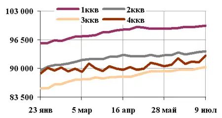 В начале года таких объектов в общем объеме предложения предлагалось более 10%, а к концу первого полугодия их доля уменьшилась до 8,2%. То есть в связи с ростом цен на вторичном рынке продолжается постепенное «вымывание» недорогого жилья. Основной объем рынка сейчас занимают квартиры, цена квадратного метра которых находится в диапазоне от 70 до 100 тыс. руб. (64,3% от объема выставленных на продажу квартир).