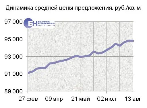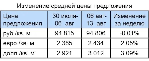 За минувшую неделю процент изменения средней цены предложения на вторичном рынке квартир в рублевом эквиваленте составил минус 0,01%, это 9,2 руб. с одного квадратного метра. Показатель средней цены предложения за неделю, с 06 августа по 13 августа 2012 года, составил 94,8 тыс. руб./кв. м. Цена предложения в долларах составила 3 тыс. за кв. м, в евро – 2,4 тыс.