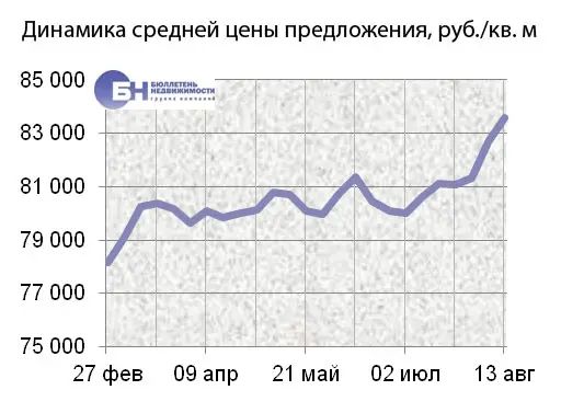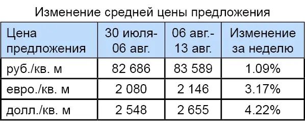 За минувшую неделю процент изменения средней цены предложения на рынке новостроек в рублевом эквиваленте составил 1,09%, это 902,9 руб. с одного квадратного метра. Показатель средней цены предложения за неделю с 06 августа по 13 августа 2012 года составил 83,6 тыс. руб./кв. м. Цена предложения в долларах составила 2,7 тыс. за квадратный метр, в евро – 2,1 тыс.