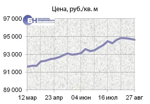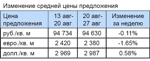 За минувшую неделю изменение средней цены предложения на вторичном рынке квартир в рублевом эквиваленте составил минус 0,11%, это 104,1 руб. с одного квадратного метра. Показатель средней цены предложения за неделю, с 20 августа по 27 августа 2012 года, составил 94,6 тыс. руб. за кв. м. Цена предложения в долларах составила 3 тыс. за кв. м, в евро – 2,4 тыс.