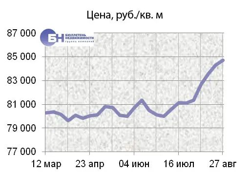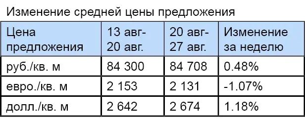 За минувшую неделю процент изменения средней цены предложения на рынке новостроек в рублевом эквиваленте составил 0,48%, это 407,7 руб. с одного квадратного метра. Показатель средней цены предложения за неделю с 20 августа по 27 августа 2012 года составил 84,7 тыс. руб. за кв. м. Цена предложения в долларах составила 2,7 тыс. за кв. м, в евро – 2,1 тыс.