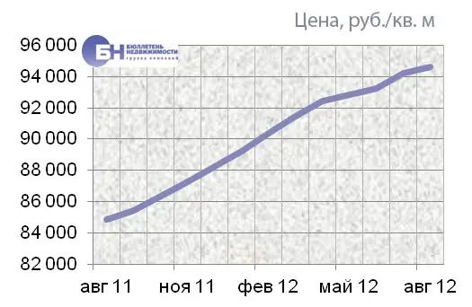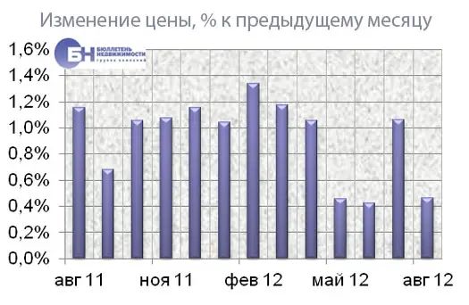 В среднем по вторичному рынку цена предложения на однокомнатные квартиры повысилась за минувший месяц на 0,3%, на двухкомнатные – на 0,9%. Трехкомнатные квартиры показали изменение на 0,1%. Средние цены предложения на конец августа 2012 года составили на однокомнатные квартиры 3,8 млн руб., на двухкомнатные квартиры 5,6 млн руб., на трехкомнатные – 7,7 млн руб.