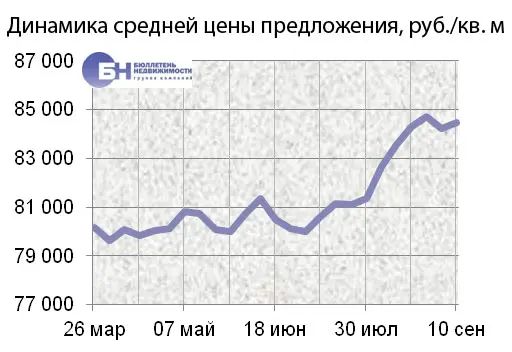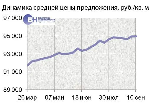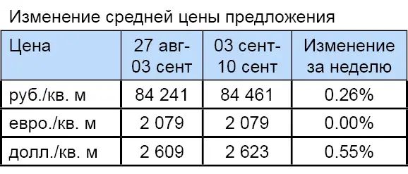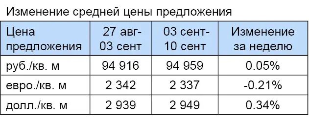 За минувшую неделю изменение средней цены предложения на вторичном рынке квартир в рублевом эквиваленте составило 0,05%, это 42,7 руб. с одного квадратного метра. Показатель средней цены предложения за неделю, с 03 сентября по 10 сентября 2012 года, составил 95 тыс. руб. за кв. м. Цена предложения в долларах составила 2,9 тыс. за кв. м, в евро – 2,3 тыс.