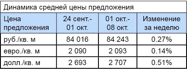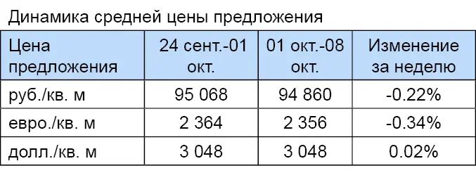 За минувшую неделю изменение средней цены предложения на вторичном рынке квартир в рублевом эквиваленте составило минус 0,22%, это 208 руб. с одного квадратного метра. Показатель средней цены предложения за неделю с 01 октября по 08 октября 2012 года составил 94,9 тыс. руб. за кв. м. Цена предложения в долларах составила 3 тыс. за кв. м, в евро – 2,4 тыс.