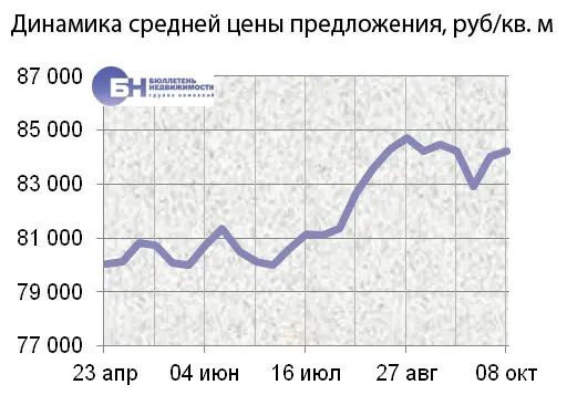 За минувшую неделю изменение средней цены предложения на рынке новостроек в рублевом эквиваленте составило 0,3%, это 227,3 руб. с одного кв. м. Показатель средней цены предложения за неделю с 01 октября по 08 октября 2012 года составил 84,2 тыс. руб. за кв. м. Цена предложения в долларах составила 2,7 тыс. за кв. м, в евро – 2,1 тыс.