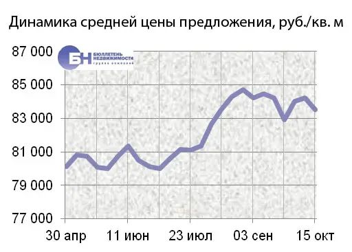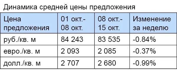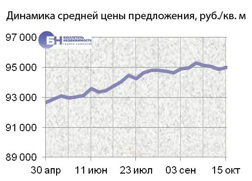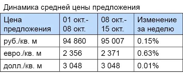 За минувшую неделю изменение средней цены предложения на вторичном рынке квартир в рублевом эквиваленте составило 0,15%, это 146,8 руб. с одного квадратного метра. Показатель средней цены предложения за неделю с 8 октября по 15 октября 2012 года составил 95 тыс. руб. за кв. м. Цена предложения в долларах составила 3 тыс. за кв. м, в евро – 2,4 тыс.