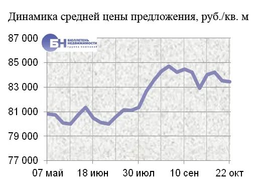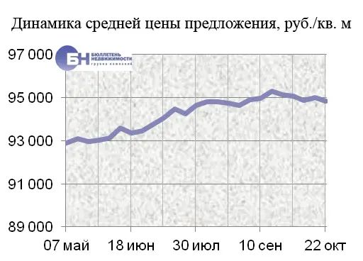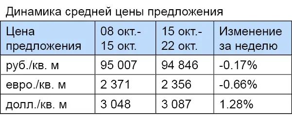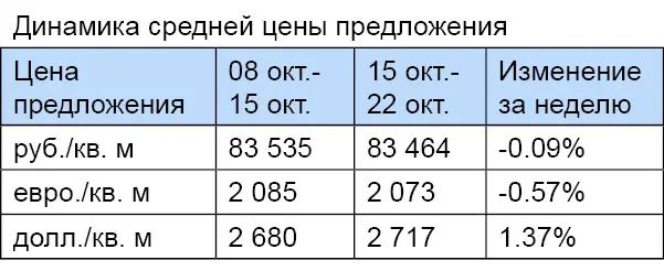 За минувшую неделю изменение средней цены предложения на вторичном рынке квартир в рублевом эквиваленте составило минус 0,17%, это 160,7 руб. с одного квадратного метра. Показатель средней цены предложения за неделю с 15 октября по 22 октября 2012 года составил 94,8 тыс. руб. за кв. м. Цена предложения в долларах составила 3,1 тыс. за кв. м, в евро – 2,4 тыс.