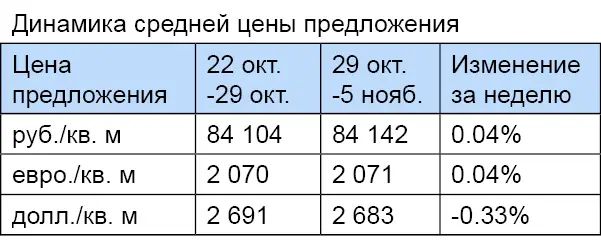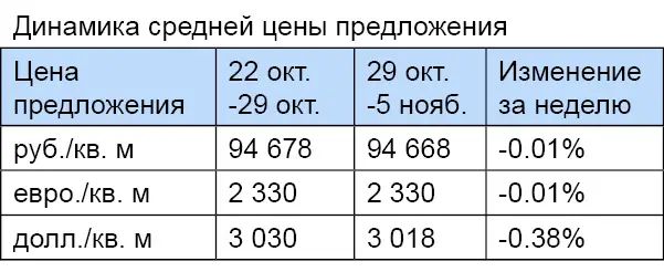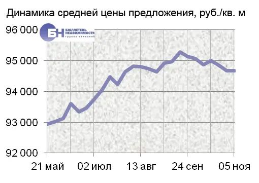 За минувшую неделю изменение средней цены предложения на вторичном рынке квартир в рублевом эквиваленте составило минус 0,01%, это 9,6 руб. с одного квадратного метра. Показатель средней цены предложения за неделю с 29 октября по 5 ноября 2012 года составил 94,7 тыс. руб. за кв. м. Цена предложения в долларах составила 3 тыс. за кв. м, в евро – 2,3 тыс.