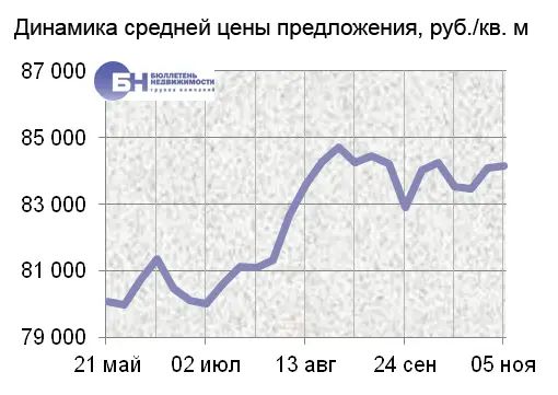За минувшую неделю изменение средней цены предложения на рынке новостроек в рублевом эквиваленте составило 0,04%, это 37,6 руб. с одного кв. м. Показатель средней цены предложения за неделю с 29 октября по 5 ноября 2012 года составил 84,1 тыс. руб. за кв. м. Цена предложения в долларах составила 2,7 тыс. за кв. м, в евро – 2,1 тыс.