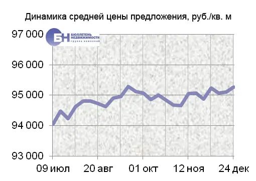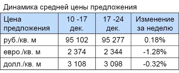 За минувшую неделю изменение средней цены предложения на вторичном рынке квартир в рублевом эквиваленте составило 0,18%, это 175,2 руб. с одного квадратного метра. Показатель средней цены предложения за неделю с 17 декабря по 24 декабря 2012 года составил 95,3 тыс. руб. за кв. м. Цена предложения в долларах составила 3,1 тыс. за кв. м, в евро – 2,3 тыс.