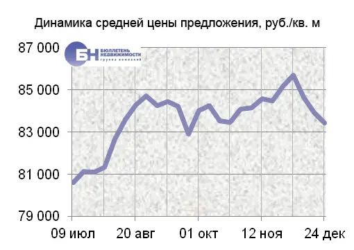 За минувшую неделю изменение средней цены предложения на рынке новостроек в рублевом эквиваленте составило минус 0,6%, это 514,9 руб. с одного кв. м. Показатель средней цены предложения за неделю с 17 декабря по 24 декабря 2012 года – 83,4 тыс. руб. за кв. м. Цена предложения в долларах – 2,7 тыс. за кв. м, в евро – 2,1 тыс.