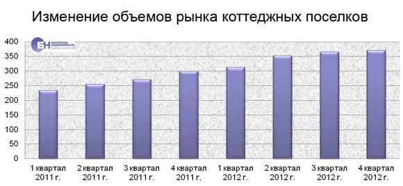Прирост количества поселков, по сравнению с предыдущим кварталом 2012 года, составил 1,4%. За год предложение увеличилось на 72 коттеджных поселка, по сравнению с аналогичным периодом прошлого года (IV квартал 2011-го), когда в продажу были выставлены объекты в 299 поселках, прирост составил 24,1%.