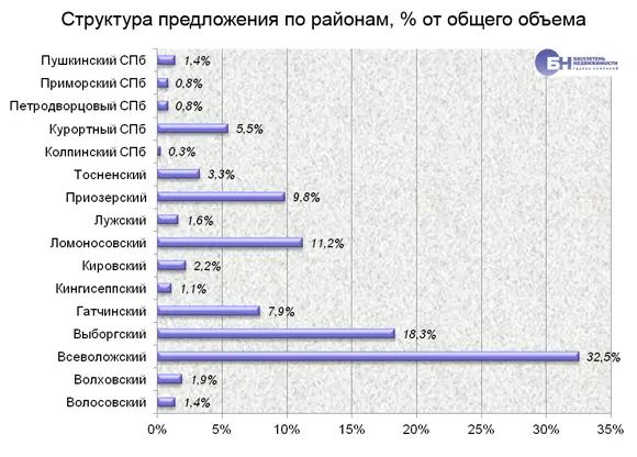 Наибольшее предложение по Ленобласти находится также в Приозерском, Ломоносовском и Гатчинском районах, в среднем их доля составляет от 8% до 11,2%.