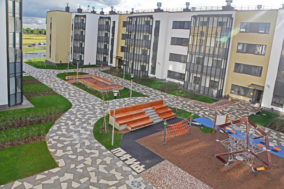 На прилегающей территории площадью 3,5 тыс. кв. м выполнено благоустройство. Для взрослых оборудовано пространство с амфитеатром, которое украшено необычным деревянным декором. Для детей создана многофункциональная игровая зона.