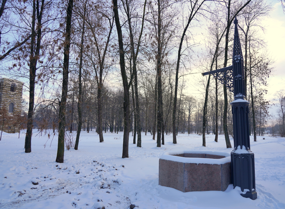 Во время Великой Отечественной войны дворец и все постройки в парке, кроме башни-руины и колодца, были разрушены. Готический колодец долгое время не действовал.