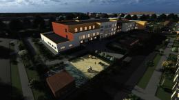 Строительство школы ведется по уникальному проекту, который был отмечен дипломом на региональном Санкт-Петербургском архитектурном смотре-конкурсе «Архитектон». Общая площадь здания составляет более 23 тыс. кв. м. Сейчас на объекте завершаются отделочные работы, идет благоустройство территории, монтаж водоподготовки бассейна и вентиляции.