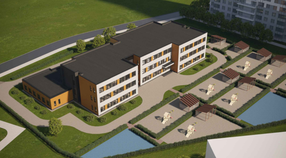 В трехэтажном здании детского сада проектной документацией предусмотрены бассейн, физкультурный и музыкальный залы, кружковые помещения. Для детей раннего возраста запроектированы отдельные выходы на игровые площадки.