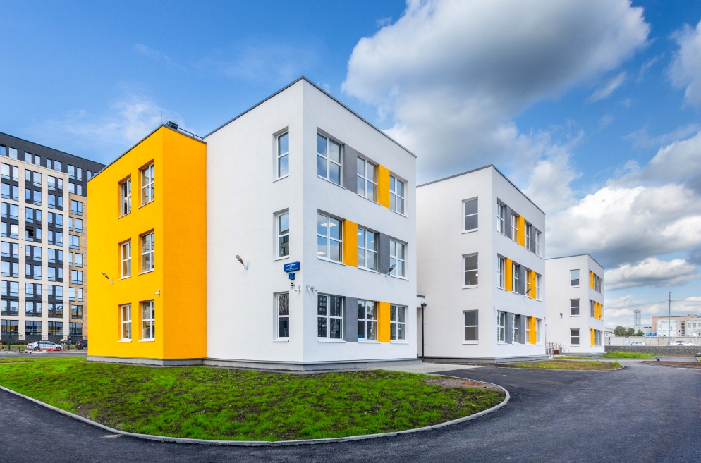 Юбилейный, 60 социальный объект девелопера сдан в проекте «Панорама парк Сосновка». Светлое здание с контрастными вставками серого и ярко-желтого цветов гармонично вписывается в новый жилой квартал. По высоте садик разноуровневый – от 2 до 3 этажей.