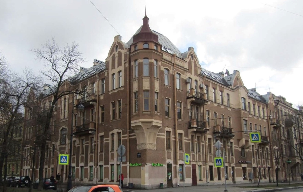 Отделка цоколя здания выполнена из известняка. Фасад по 16-й линии В.О. акцентирован прямоугольным эркером на кронштейнах, фасад по Большому проспекту В.О. – ризалитом. Угол дома акцентирован гранёным эркером, завершённым башенкой с гранёным куполом со шпилем.
