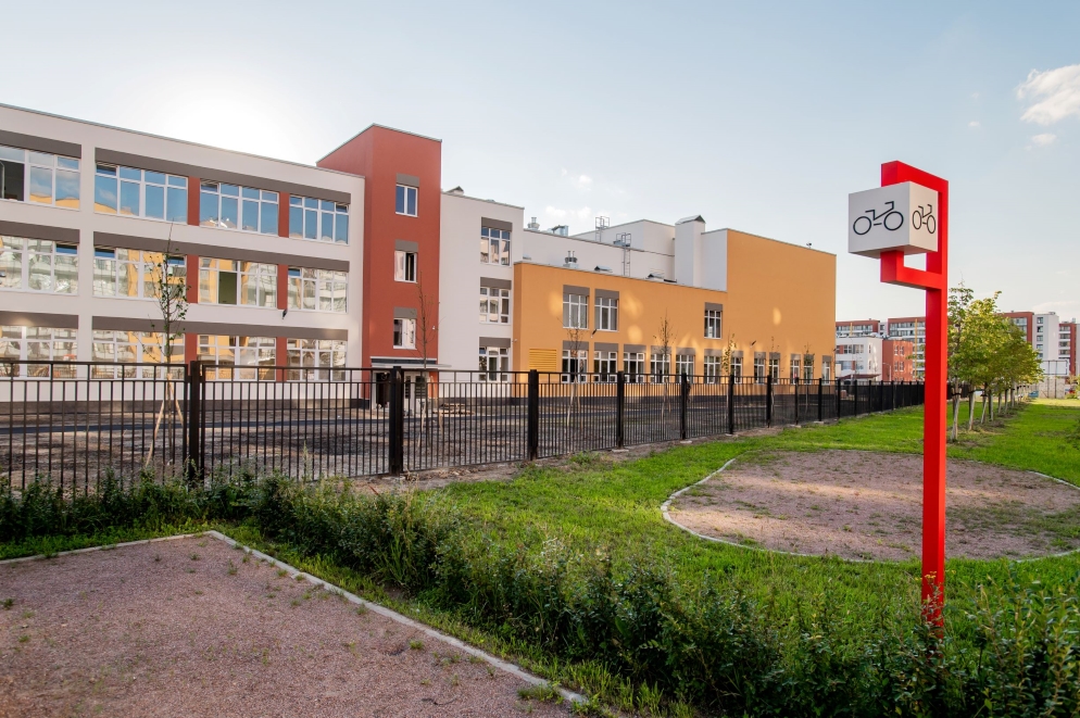 На пришкольной территории обустроены футбольное поле, площадки для игр в волейбол и баскетбол, легкоатлетические дорожки, уличные тренажеры и полоса препятствий.