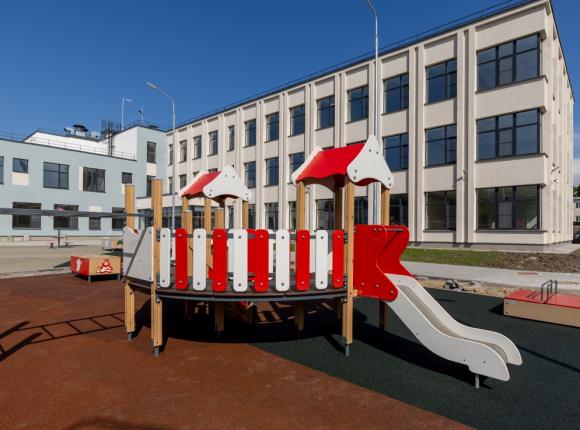 В здании на Радловской улице предусмотрены большой и малый бассейны, библиотечное пространство, специально оборудованная игровая комната, спальня для младших классов, учебные классы, мастерские и столовая.