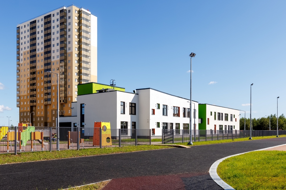 Двухэтажное здание общей площадью около 4 тыс. кв. м возведено на улице Тихой, рядом с третьим и четвертым участками жилого комплекса ЦДС «Новые Горизонты».