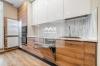 в стильный кухонный гарнитур встроены холодильник, микроволновая печь и духовой шкаф, посудомоечная машина, варочная поверхность с защитой от детей, вытяжка.