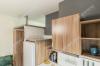 Из техники: робот-пылесос, большая посудомойка, СВЧ-печь, стиральная машинка, большой холодильник, утюг, гладильная доска и сушилка. Есть сейф, кондиционер, шкаф и рабочий стол.