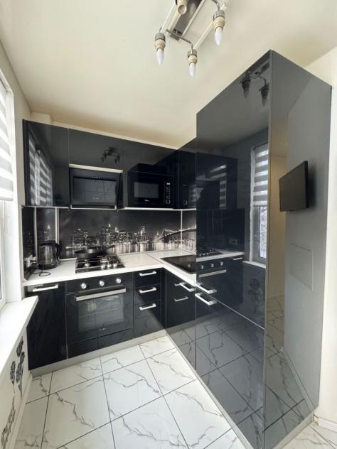 Внутри помещения выполнен евроремонт: установлены натяжные потолки и стеклопакеты во всех комнатах, полы покрыты ламинатом и кафелем. Санузел совмещённый, оснащён душевой кабиной, теплый пол. Квартира укомплектована мебелью в комнатах и на кухне, а также бытовой техникой — есть два телевизора, микроволновая печь, холодильник, стиральная машина и газовая плита. Подключён интернет.