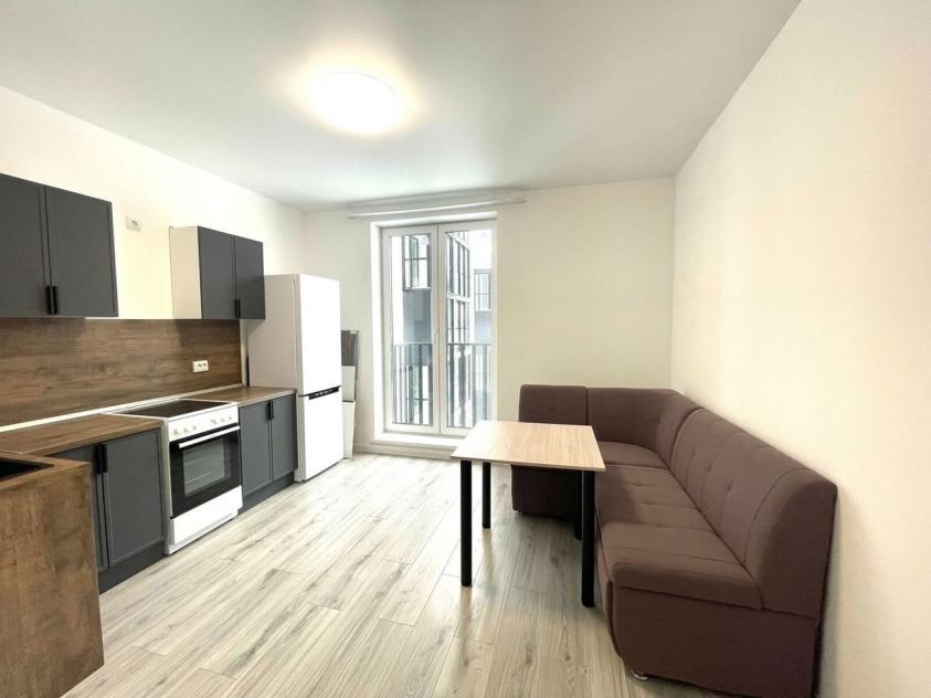 Кухня просторная. Может служить и гостиной. Помещения оборудованы всем необходимым: на кухне установлена мебель, есть мягкий уголок с дополнительным спальным местом, а также холодильник и электрическая плита. В квартире выполнен современный евроремонт от застройщика. Окна выходят во двор, имеется балкон в комнате, а на кухне -французский балкон.