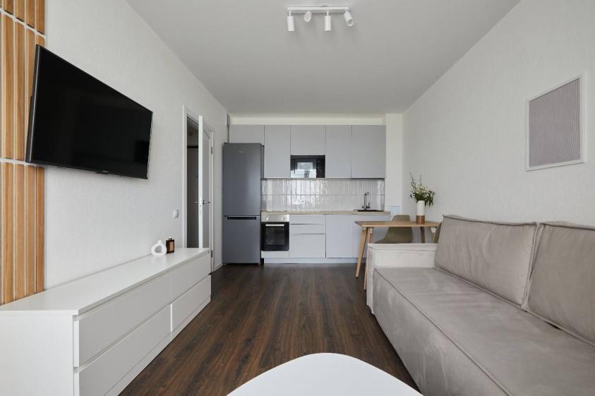 + Есть все необходимое (и даже больше!) для комфортного проживания: продуманная встроенная кухня, есть посудомоечная машина, духовой шкаф, варочная панель, микроволновая печь, вытяжка и т.д. В зоне гостиной можно удобно расположиться на диване и смотреть ТВ. В спальне полноценная 2-х спальная кровать с ортопедическим матрасом, вместительный гардеробный шкаф.