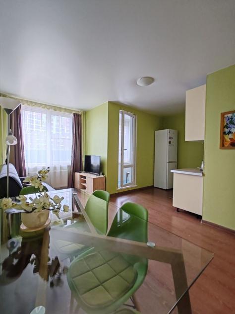 - Зона кухни: Обеденный стол, стулья, электроплита на 2 конфорки, вытяжка, холодильник двухкамерный (тихий).
