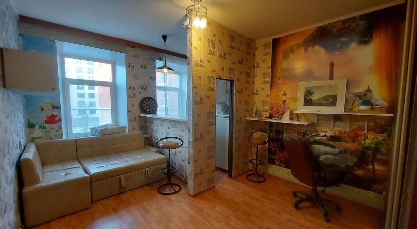 В комнате есть все необходимое для проживания- удобный диван, зеркальный шкаф, барная стойка, стулья, холодильник, стиральная машина. Собственный санузел, на общей кухне свой стол и плита в индивидуальном пользовании.