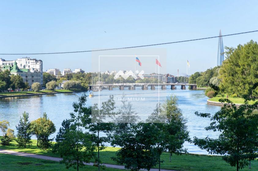 Двусторонняя квартира площадью 218 кв.м расположена на втором этаже и обращена своими окнами на набережную Средней Невки, с которой открывается панорамный вид на Елагин остров. Окна спальни и ванной комнаты выходят во благоустроенный двор-атриум , который накрыт стеклянным куполом. Две мастер- спальни со своими сан. узлами и гардеробными, гостиная 60кв.м с видом на воду.