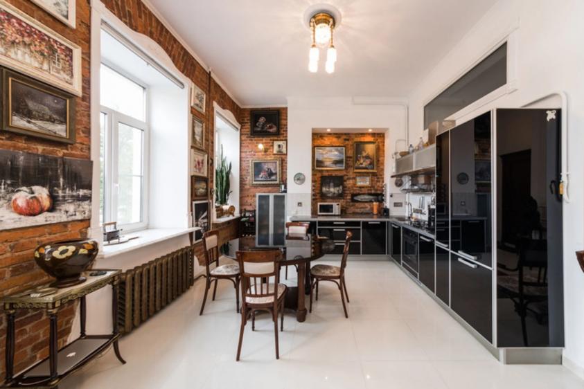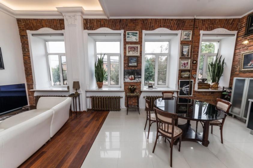 -Стена из кирпича старинной кладки, стильный слой штукатурки придают комнате уют, особенную атмосферу и элегантность старины.