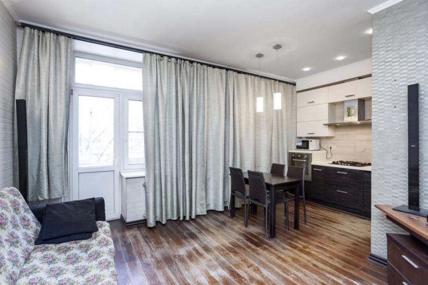 Кухня гостиная 19 кв. метров, два окна и застекленный балкон.