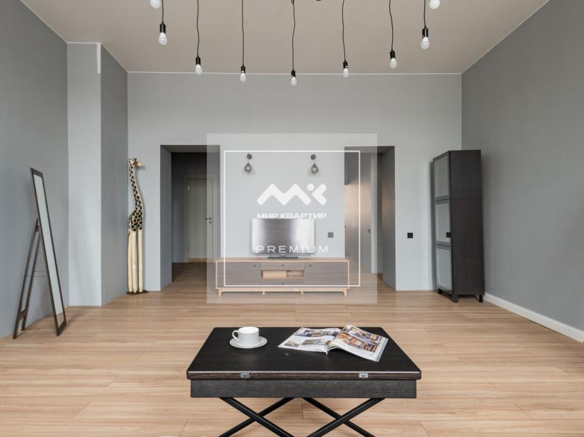 Квартира расположена на 5-м этаже, окнами на две стороны. Общая площадь 100,1 кв.м. Большая гостиная - 34 кв.м., спальня 16,6 кв.м. Кухня 18,9 кв.м с видом во двор на петербургские крыши.
