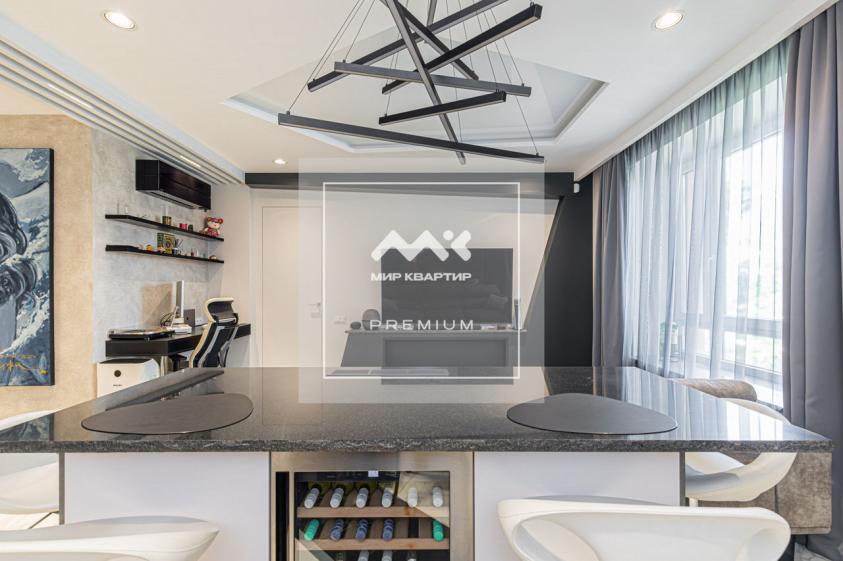 Квартира выполнена в современном стиле, представлено множество сценариев освещения, а так же ряд LED подсветок. В квартире установлена профессиональная система доступа и сигнализации, итальянская входная группа, японские дизайнерские кондиционеры, система проветривания т очистки воздуха и еще многое другое премиального качества.