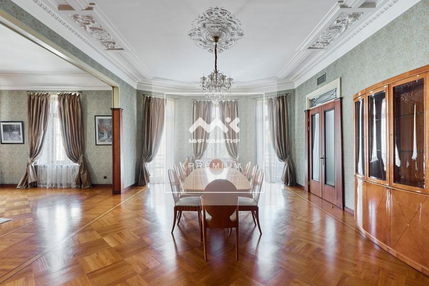 Парадная широкая лестница, лифт, по 2 квартиры на этаже, коммунальных квартир нет! Охрана! Квартира просторная 381 кв. метр, с функциональной планировкой: большая угловая гостиная зона в 144 метров, из которой выход на 3 балкона, 4 отдельные большие комнаты, одна из них в действующим родным камином, просторная ванная комната с сауной, Сан узел для гостей, столовая зона и кухня.