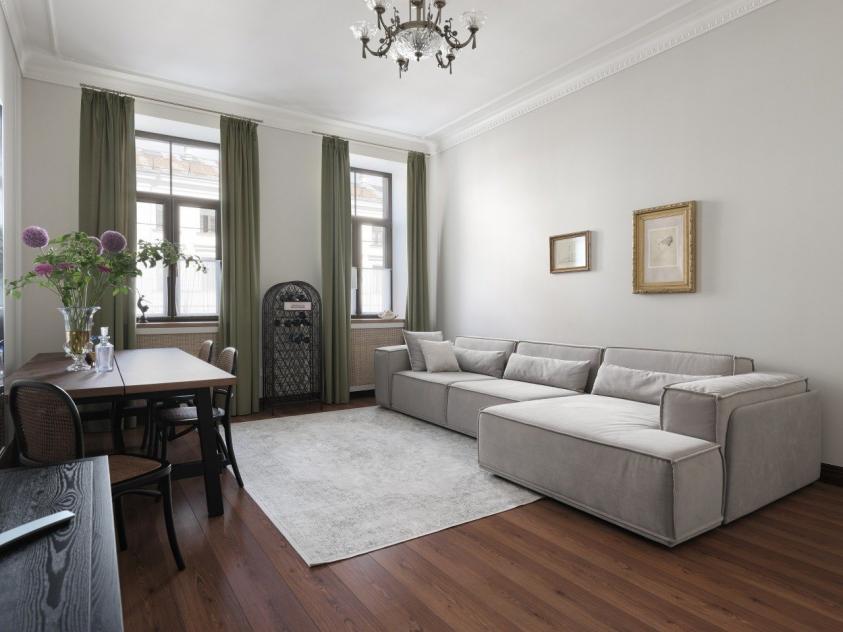 Продается фасадная 5- комнатная квартира в центре Василеостровского района . Дом архитектора Варнек И.А. , стиль - классицизм . Дом малонаселенный , после капитального ремонта с железобетонными перекрытиями . Квартира солнечная за счет 9 больших окон с видами в большой зеленый двор и на проспект . Удобная функциональная и узаконенная планировка . Большая кухня - столовая 32,7 кв.м. , гостиная 26,5 кв.м. , кабинет 24,9 кв.м и три спальни - 21,9 ; 13,5 ; 19,4 кв.м. Высокие потолки 3,6 метра . Кухня - столовая оборудована всей необходимой мебелью и бытовой техникой . В квартире два полноценных санузла. Ванная комната и душевая выполнены с использованием дорогостоящих материалов . В квартире есть помещения для хранения . Парковка автомобиля в большом зеленом дворе . В непосредственной близости с домом множество магазинов , кафе , набережная реки Невы , театры , музеи , университеты и лучшие школы города , включая физико - математический лицей . Квартира продается с мебелью , бытовой техникой и готова к проживанию . В пешей доступности 2 ст. метро - Горный институт и Василеостровская , до которой 7 мин . пешком . Полная стоимость в договоре . Прямая продажа .