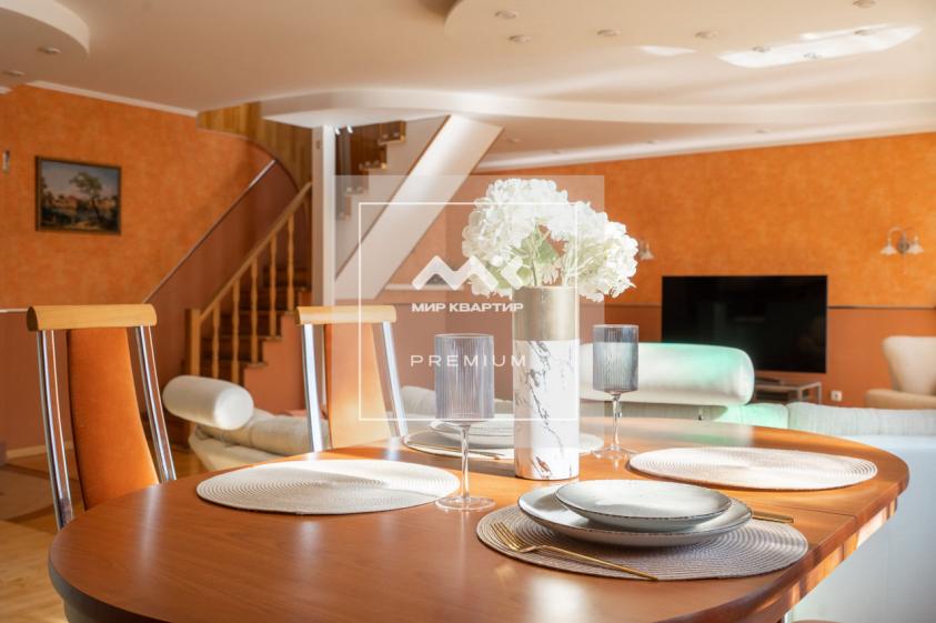 Общая площадь квартиры 184 кв.м. На первом уровне расположена кухня гостиная (70 кв.м), спальня и санузел. На втором уровне (мансарда) две спальни и большая ванная комната.