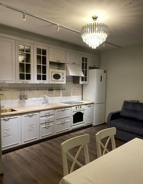Кухня укомплектована кухонным гарнитуром со встроенной техникой, остается бонусом новым владельцам.