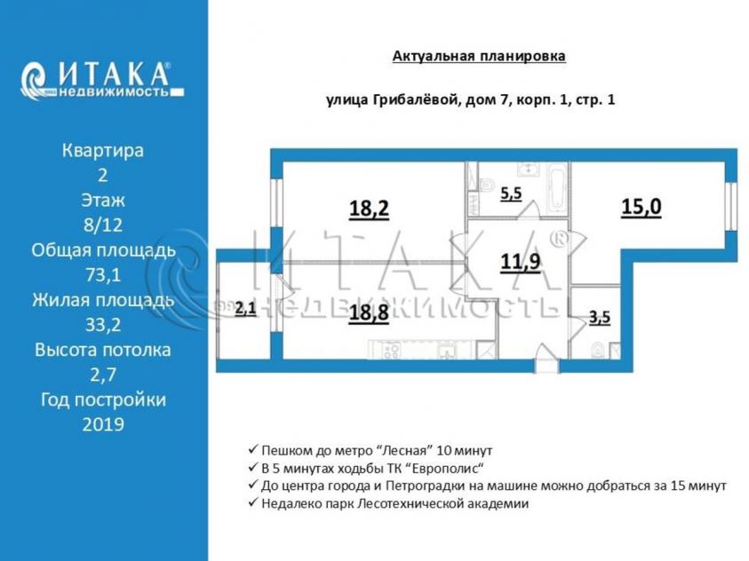 1-92722 Продаётся современная двухкомнатная квартира в новом жилищном комплексе комфорт класса «Life Лесная». Квартира двухсторонняя, просторная кухня 18.8 м. с застеклённой лоджией и комната 18.2 выходят на ул. Грибалёвой, окна комнаты 15 м. выходят в пространство внутреннего двора.
