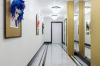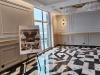 просторное представительское лобби с произведениями искусства, дизайнерской мебелью и мягким освещением,