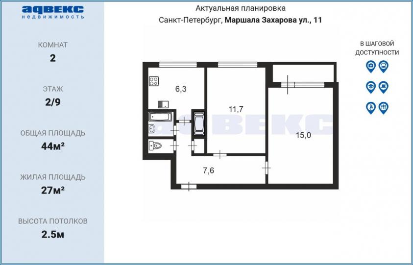 Общая площадь квартиры составляет 44 квадратных метра. Жилые комнаты имеют размеры 10 и 17 квадратных метров соответственно, кухня занимает 6,3 квадратных метра. Высота потолков — 2,5 метра. Квартира располагается на втором этаже девятиэтажного панельного дома. Планировка предусматривает раздельный санузел. Окна выходят во двор, что снижает уровень шума с улицы. Для приготовления пищи в квартире установлена газовая плита.